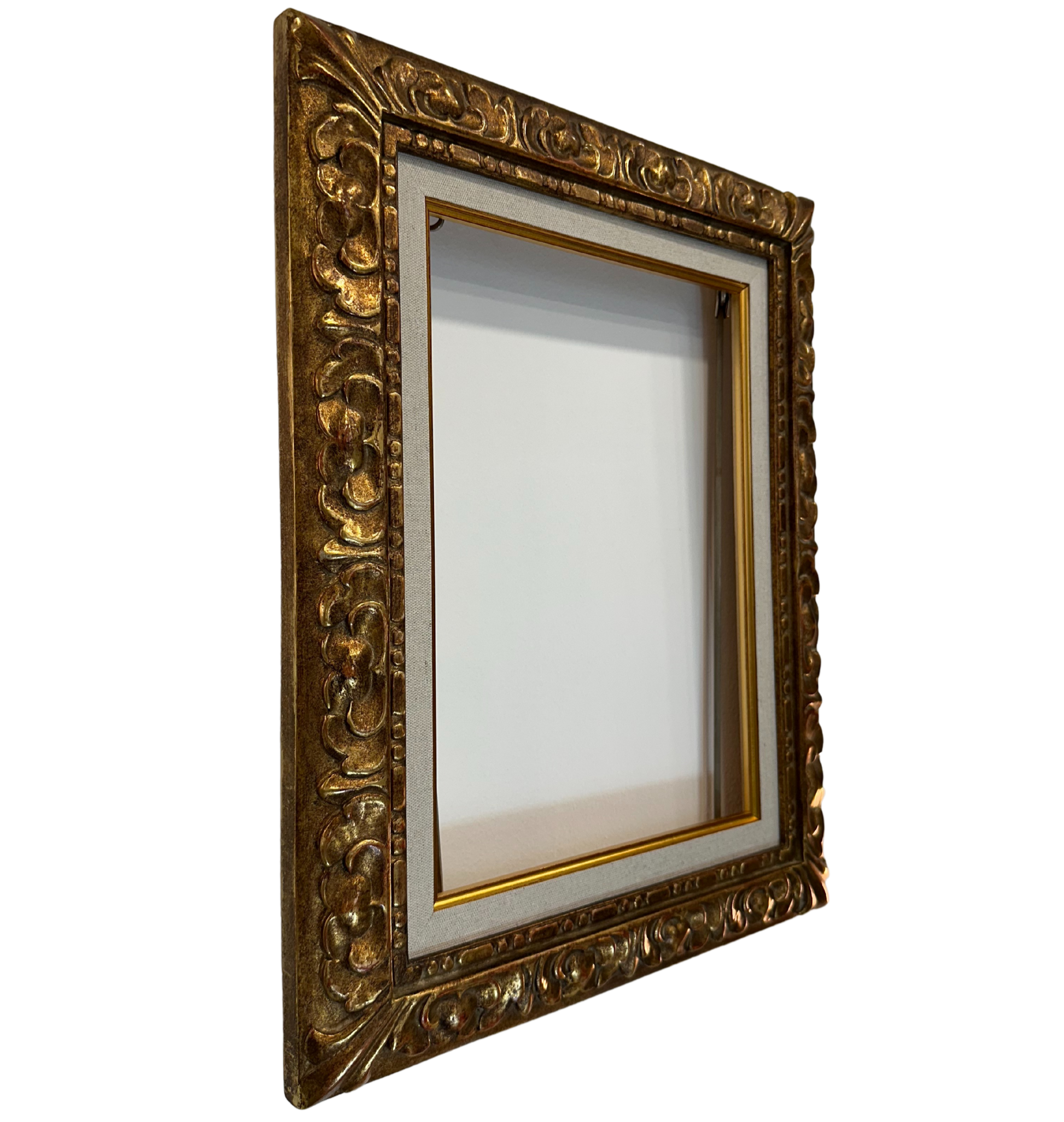 Les cadres de tableaux CL10 offrent une largeur de baguette de 8cm pour un style élégant. Les coins rebouchés et la frise rinceaux stylisé ajoutent une touche de sophistication, tandis que la gorge perlé et le doré méplat sculpté complètent le motif de feuille d'angle pour un look artistique.
