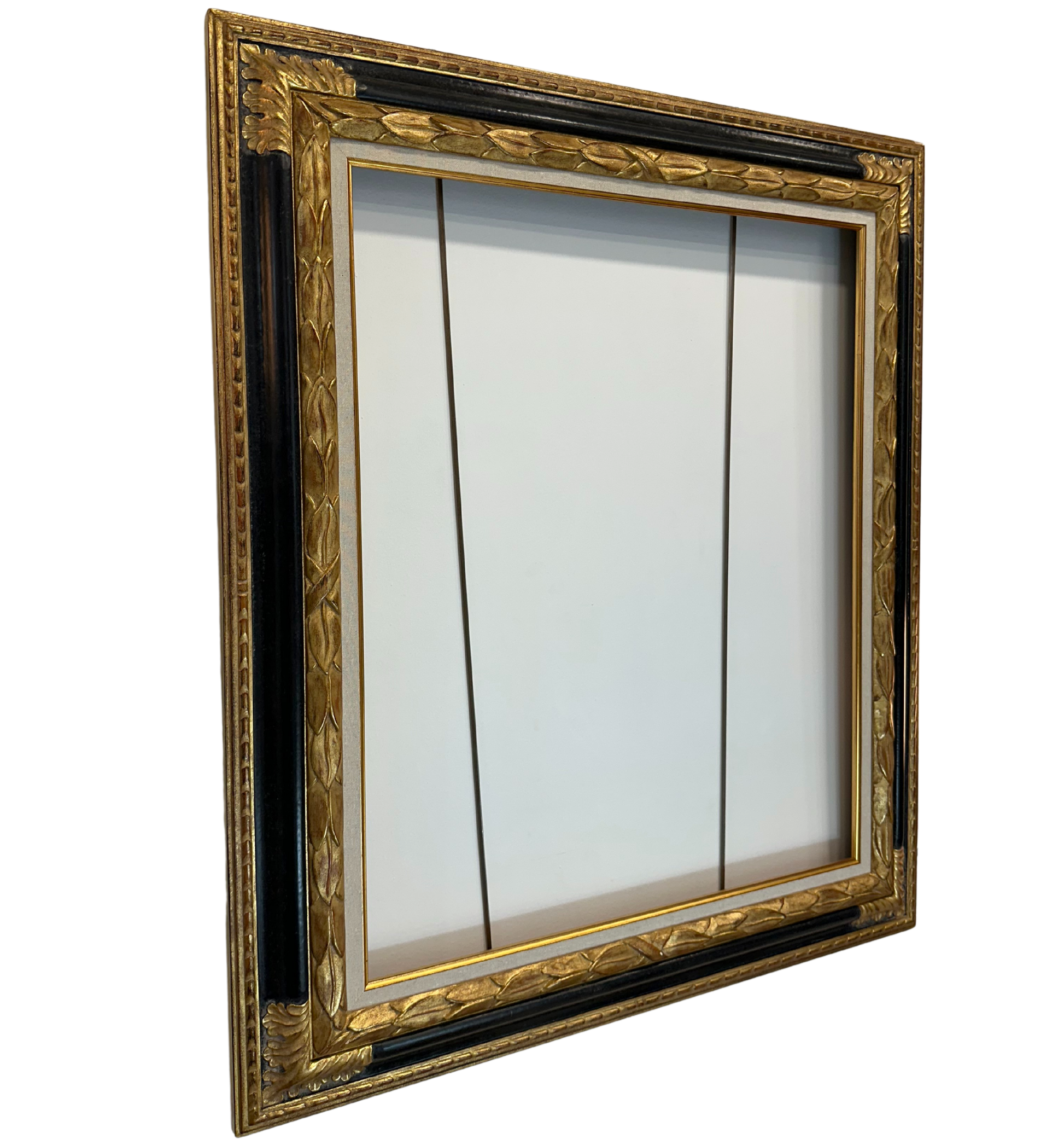 Offrez à vos œuvres d'art un écrin de luxe avec le cadre de tableau exclusif CL11. Avec une largeur de baguette de 10cm et des coins rebouchés, ce cadre noir et doré offre une pente inversée et des détails élégants tels que des feuilles de laurier à l'intérieur et des feuilles d'acanthe en décor d'angle. Laissez-vous séduire par sa frise de feuilles stylisées pour une touche de sophistication supplémentaire.