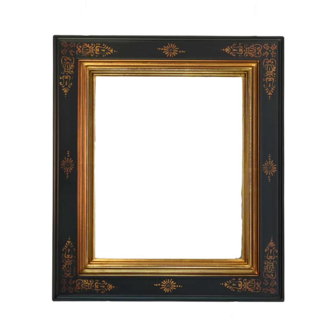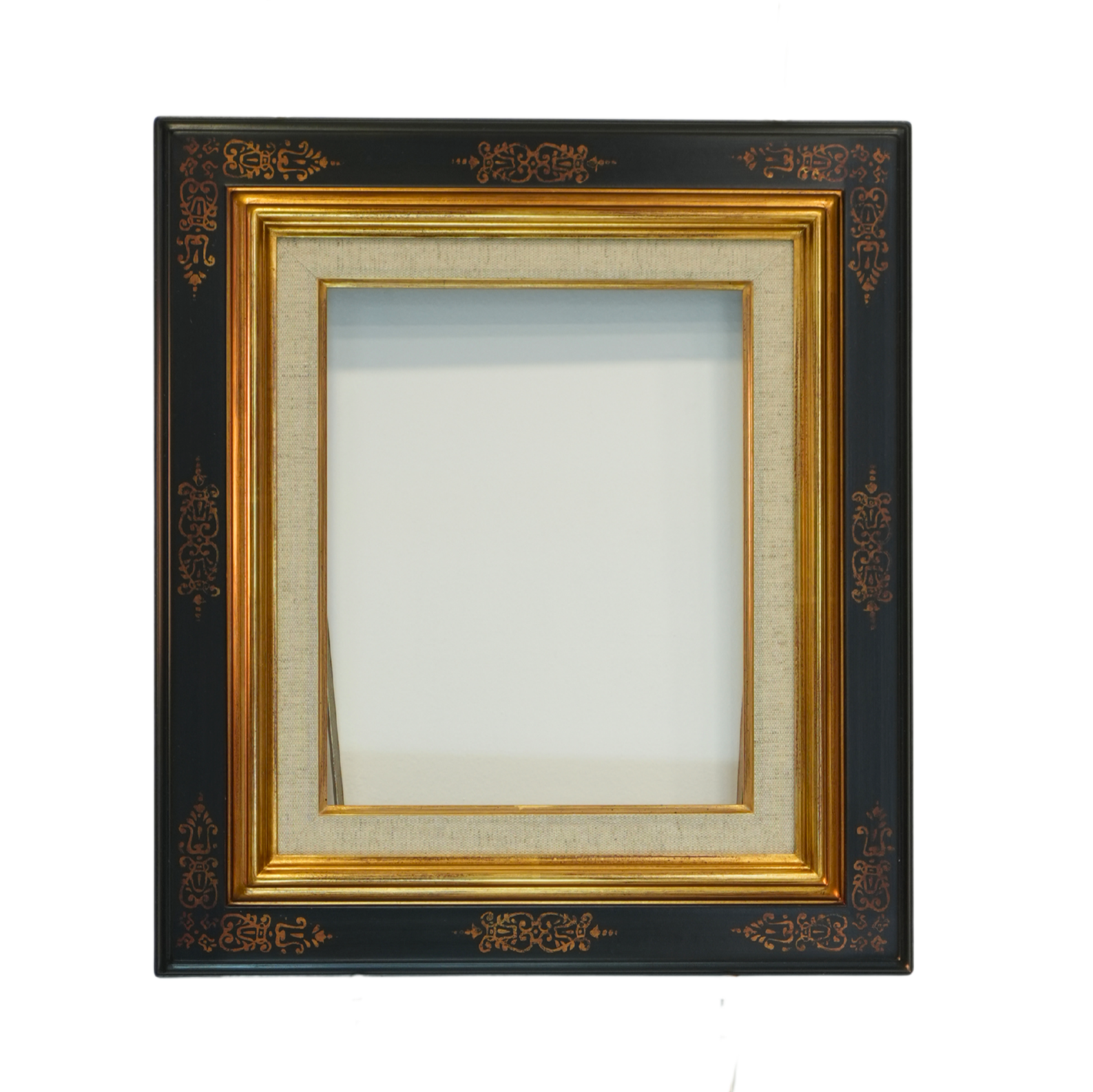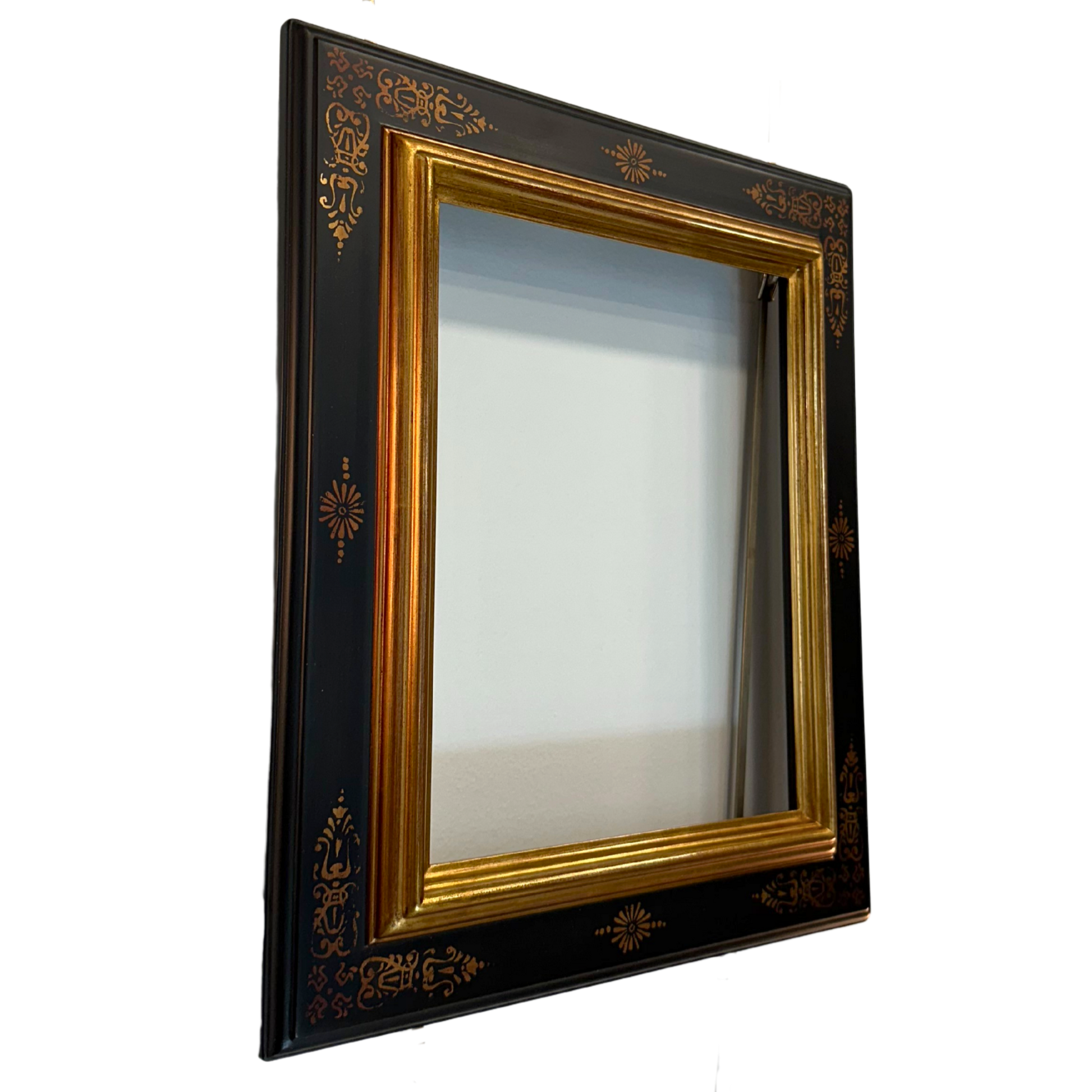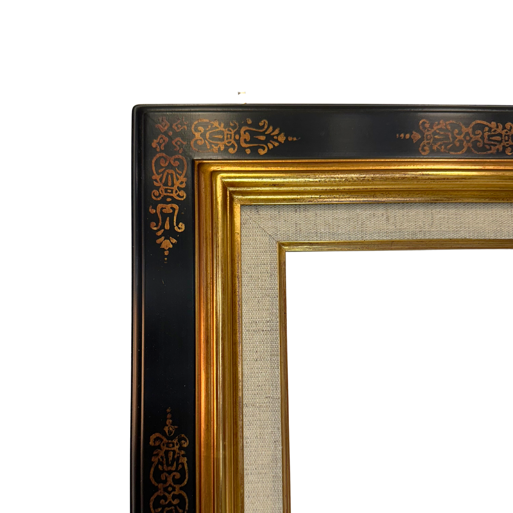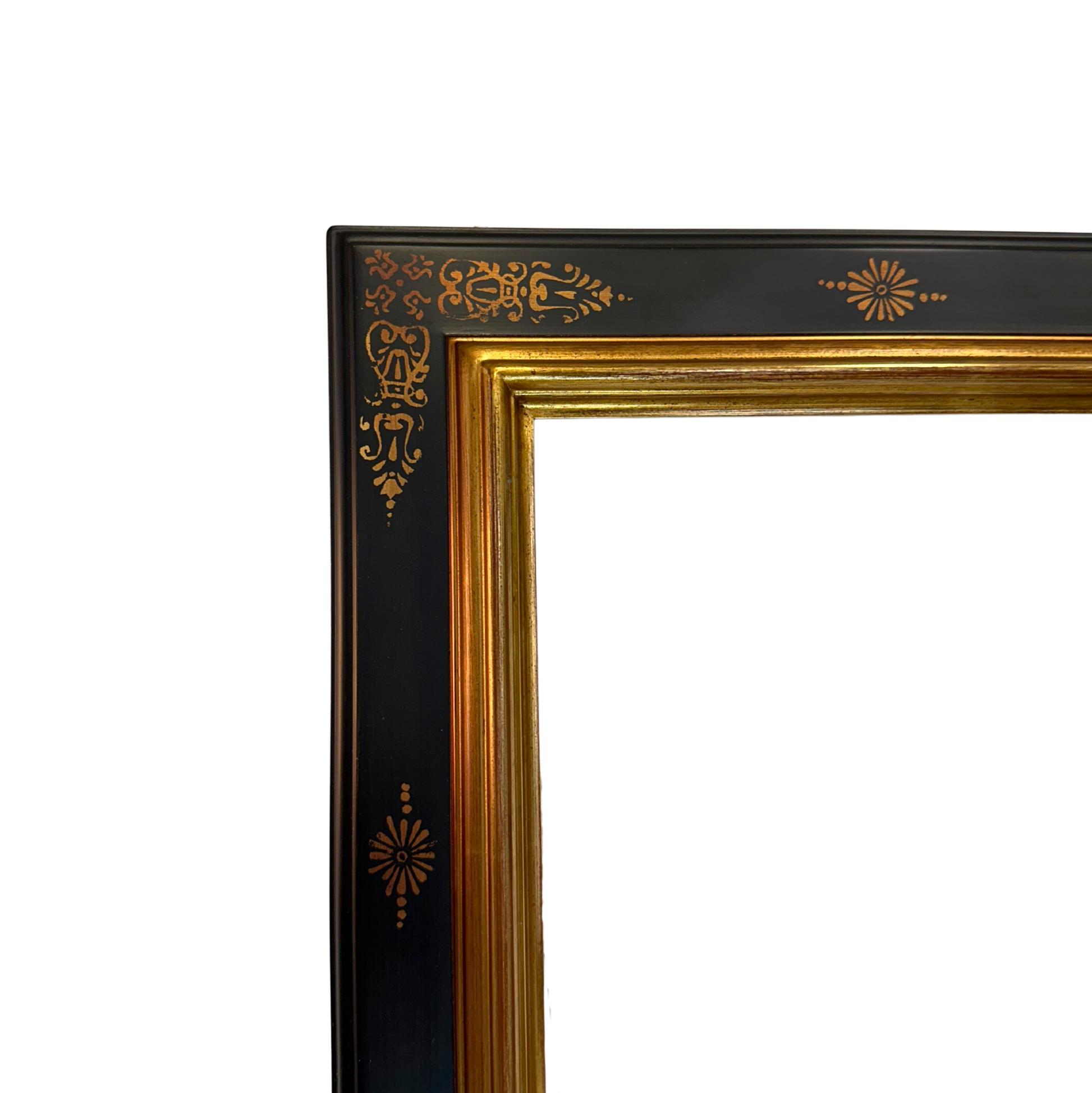 Cadre élégant à cassetta avec baguette de 6cm, alliant noir et doré dans un motif raffiné de feuilles stylisées. Les angles et le milieu présentent une finition dorée distinctive, offrant un contraste sophistiqué qui mettra en valeur vos œuvres avec une touche classique et intemporelle.